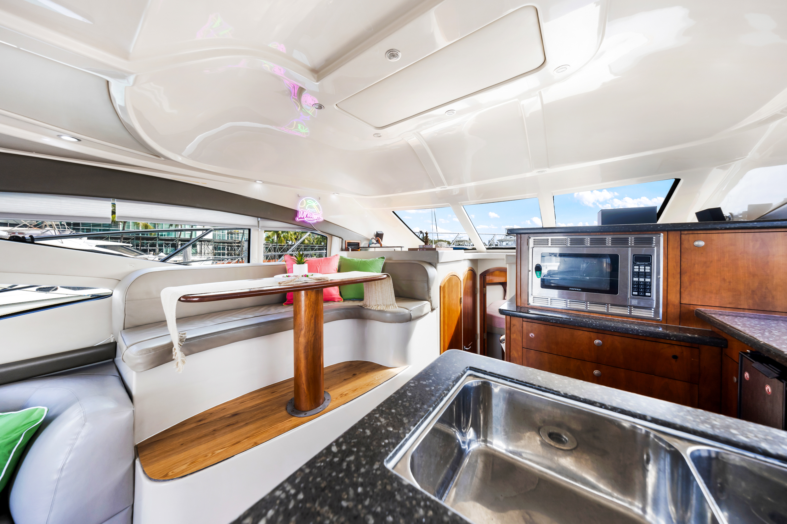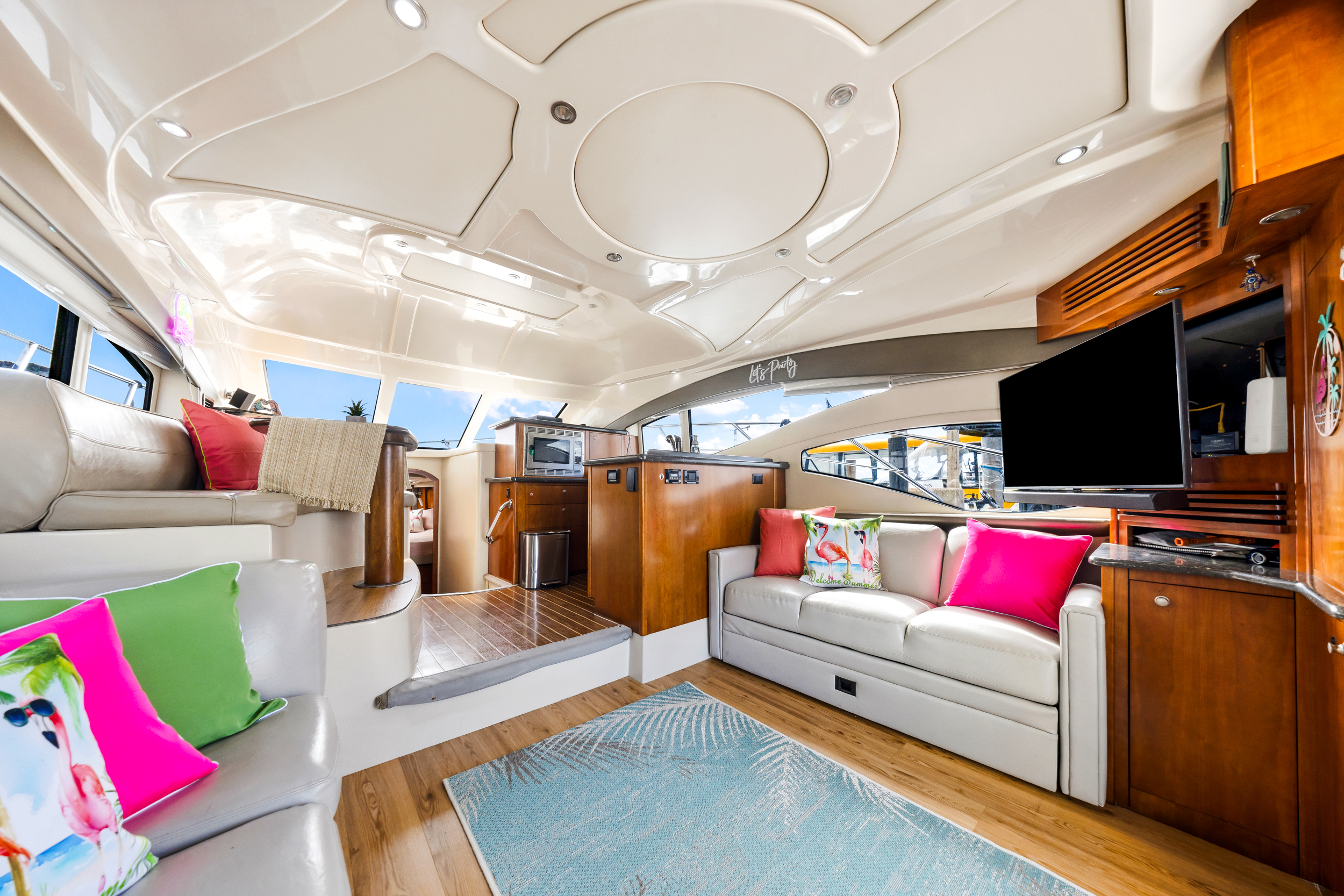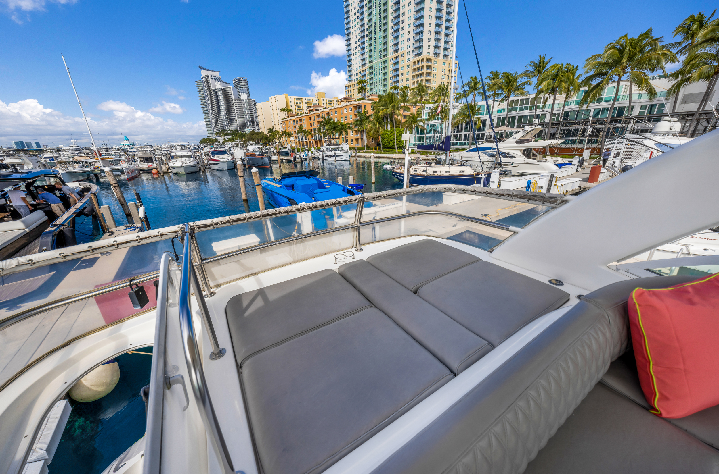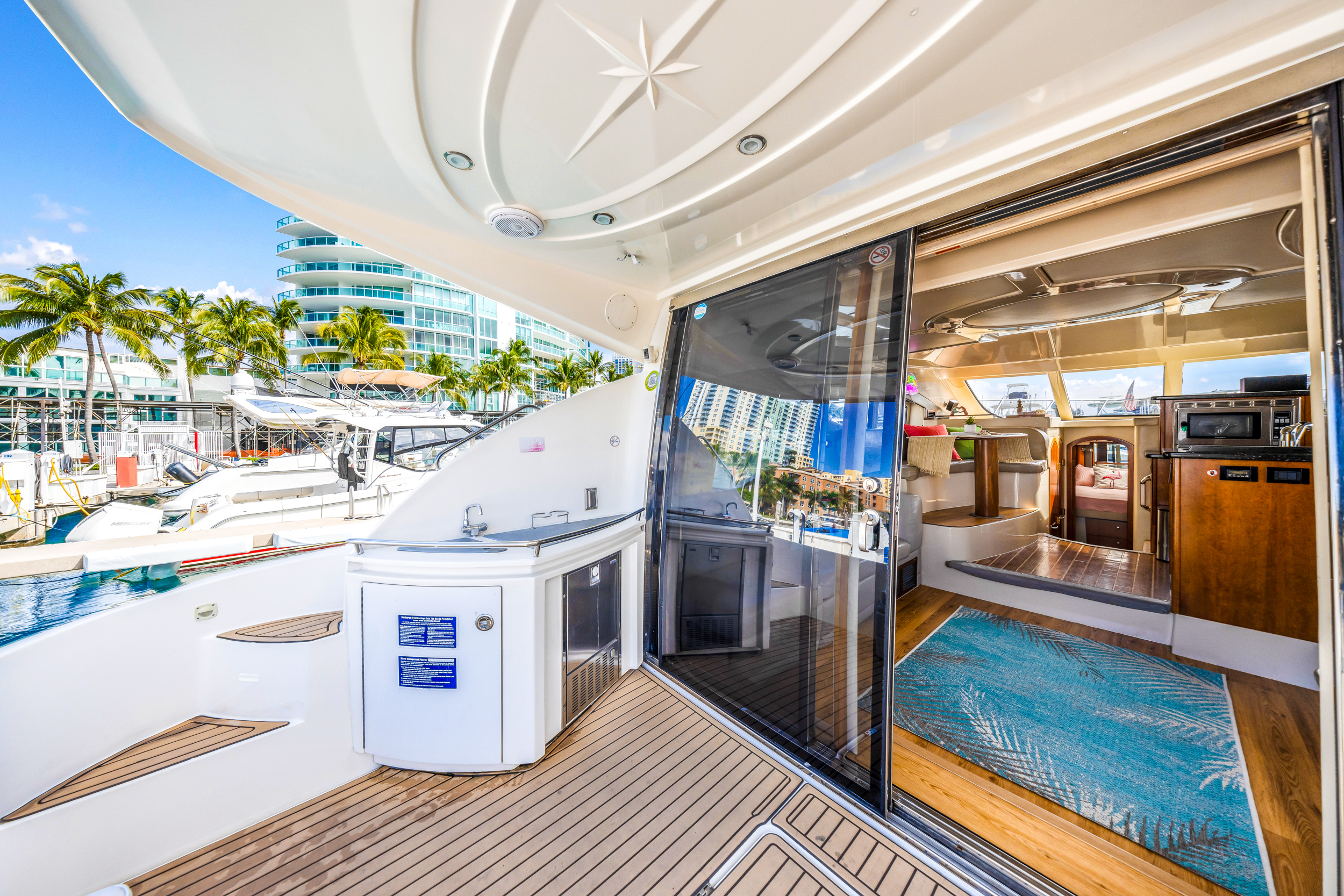 - Spacious sitting area with table and 2 sun-beds on flybridge