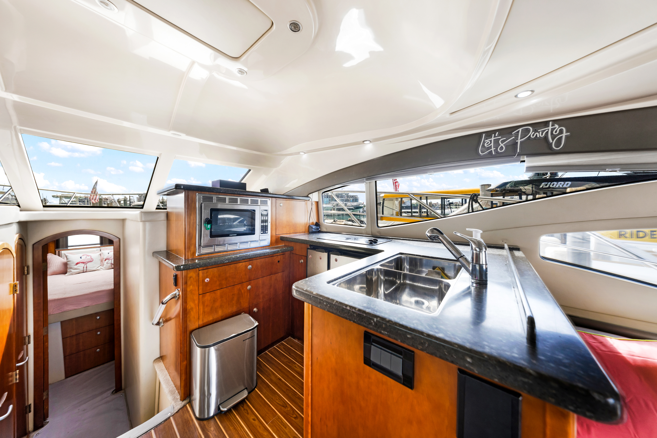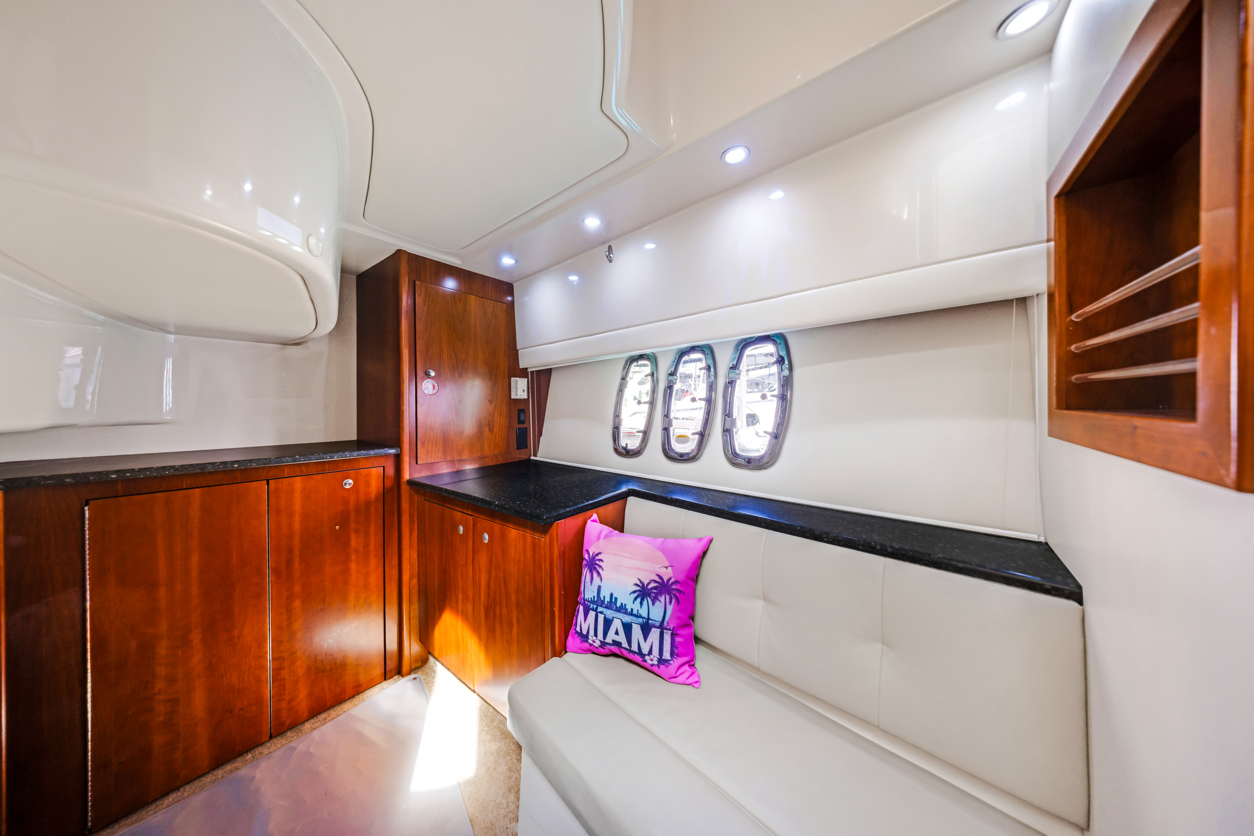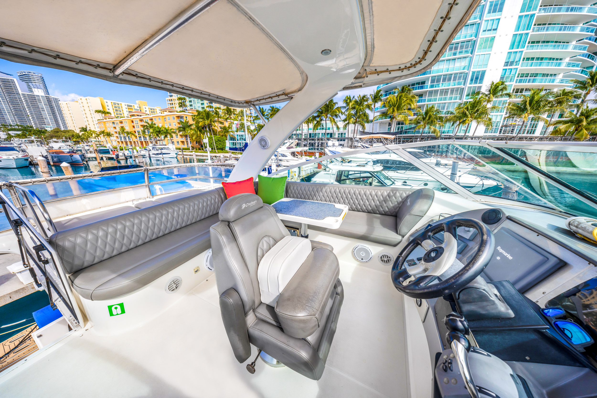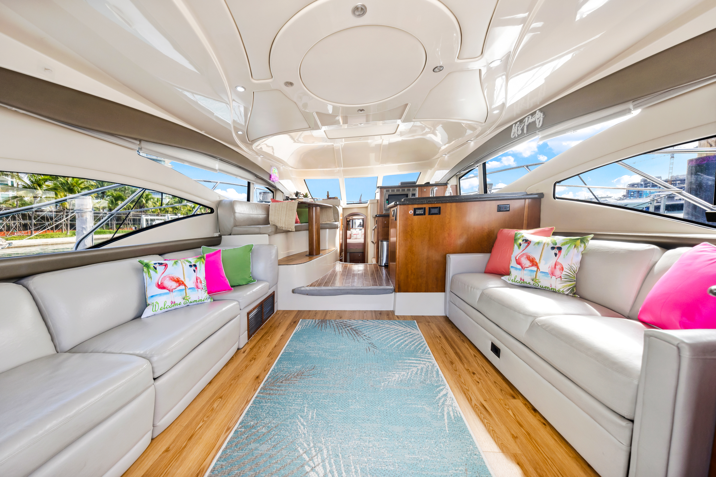 - Spacious sitting area with table and 2 sun-beds on flybridge