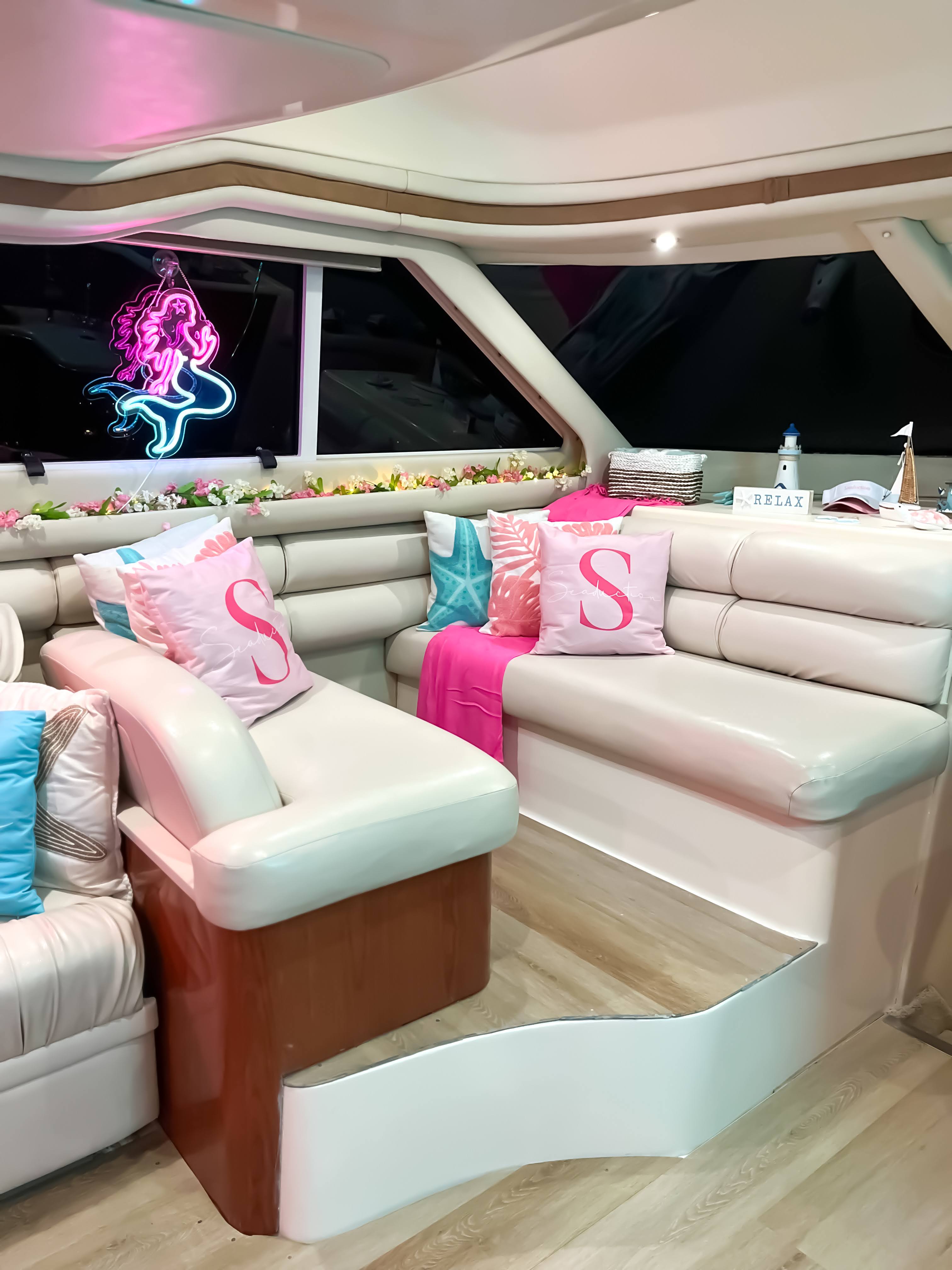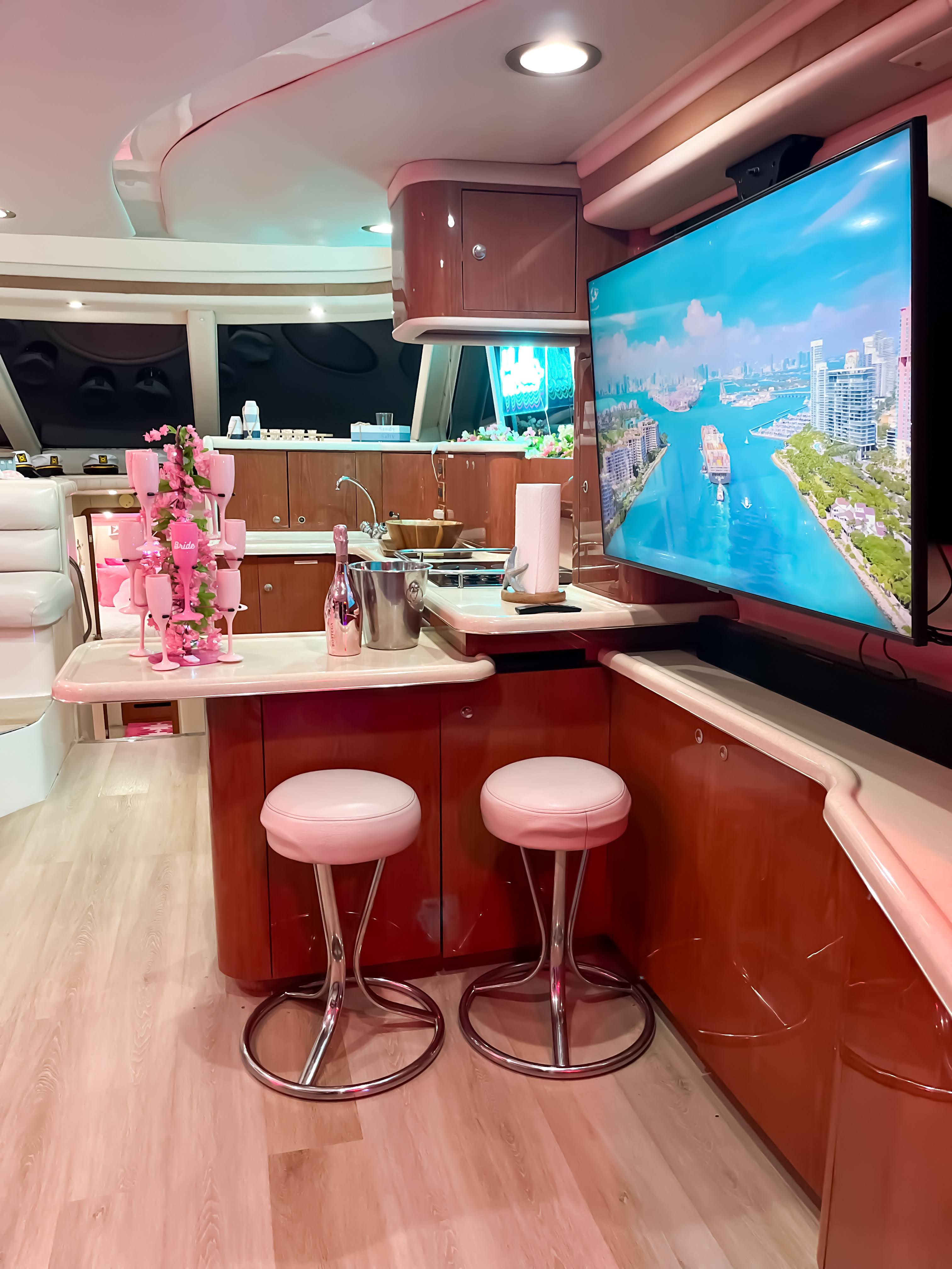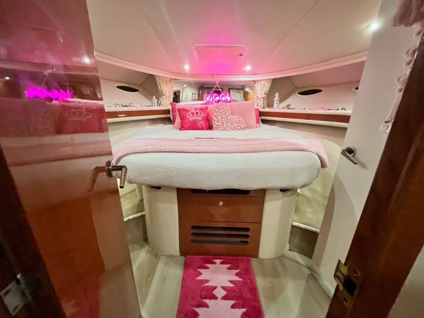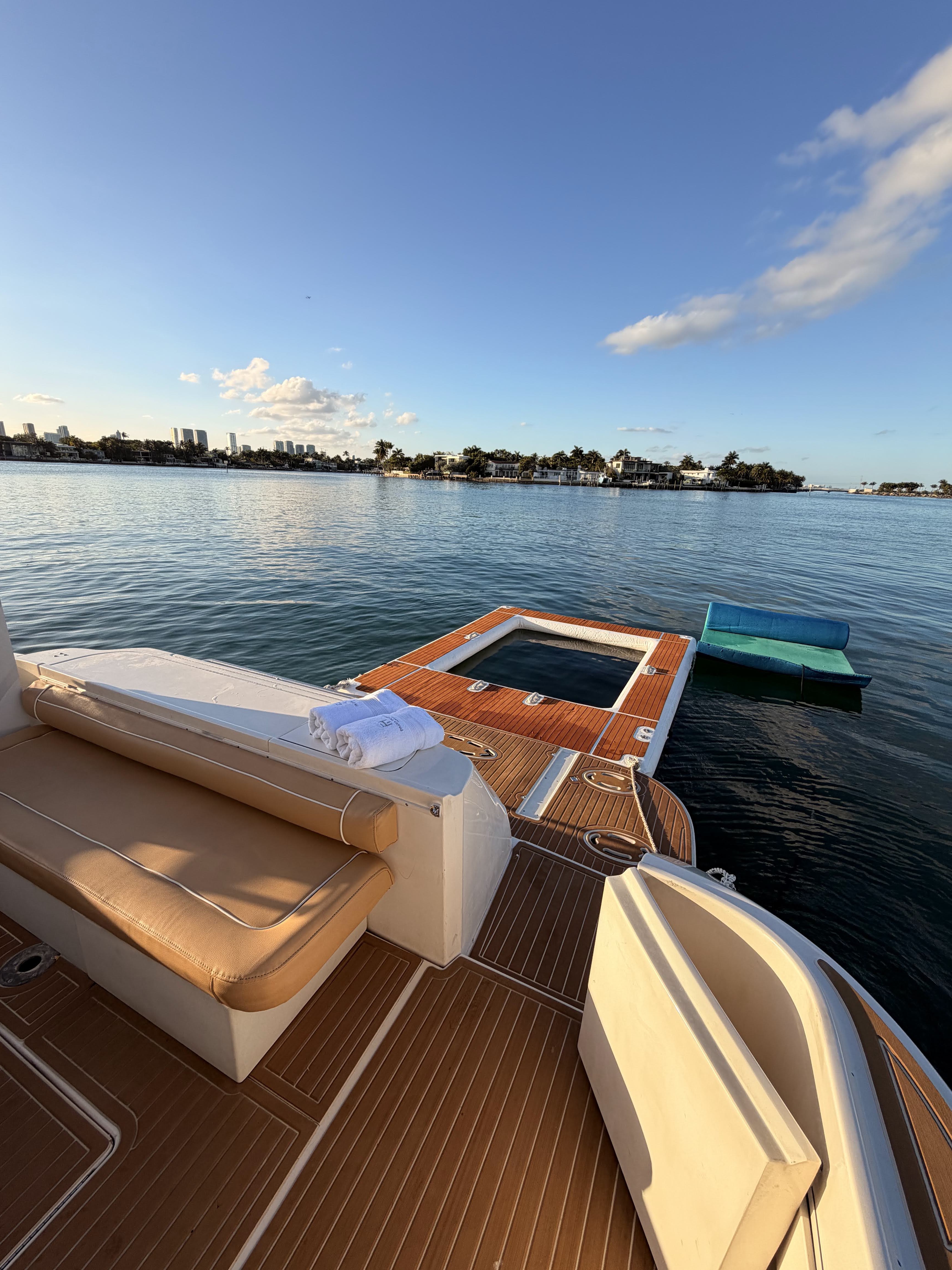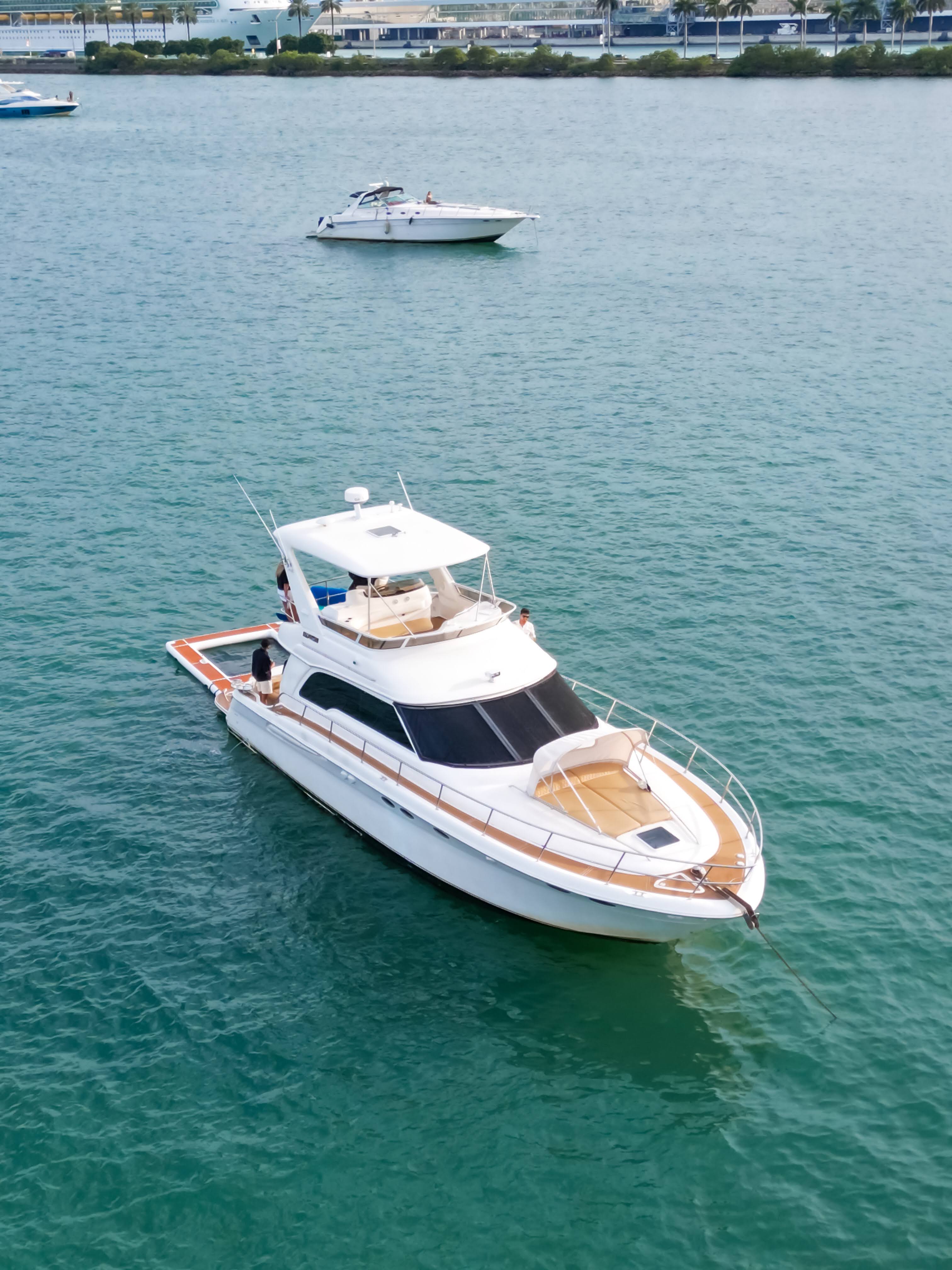 Featuring a sleek ivory-and-tan exterior, open flybridge, and a spacious aft lounge, it’s built to accommodate up to 13 guests with style and comfort. Ideal for day charters and cityscape escapes, it offers: