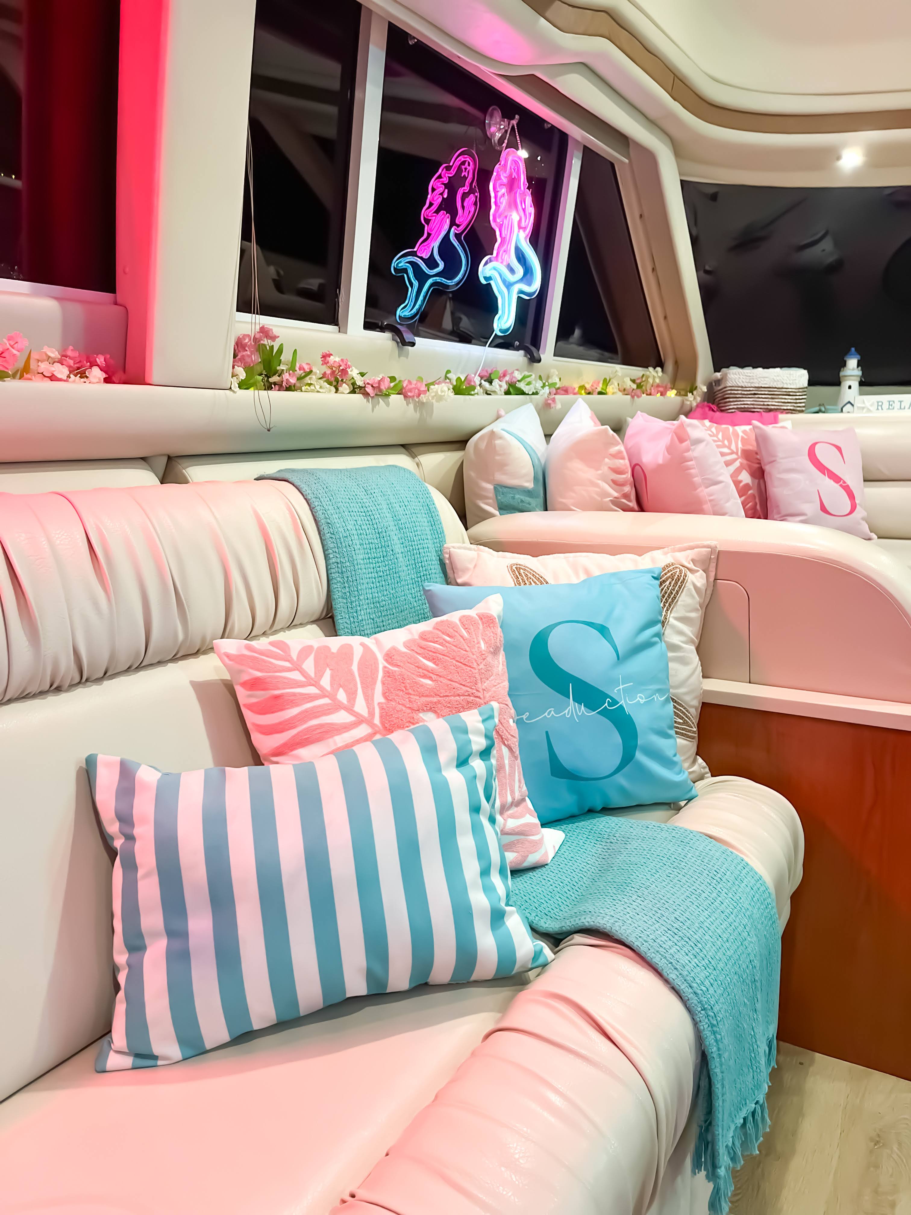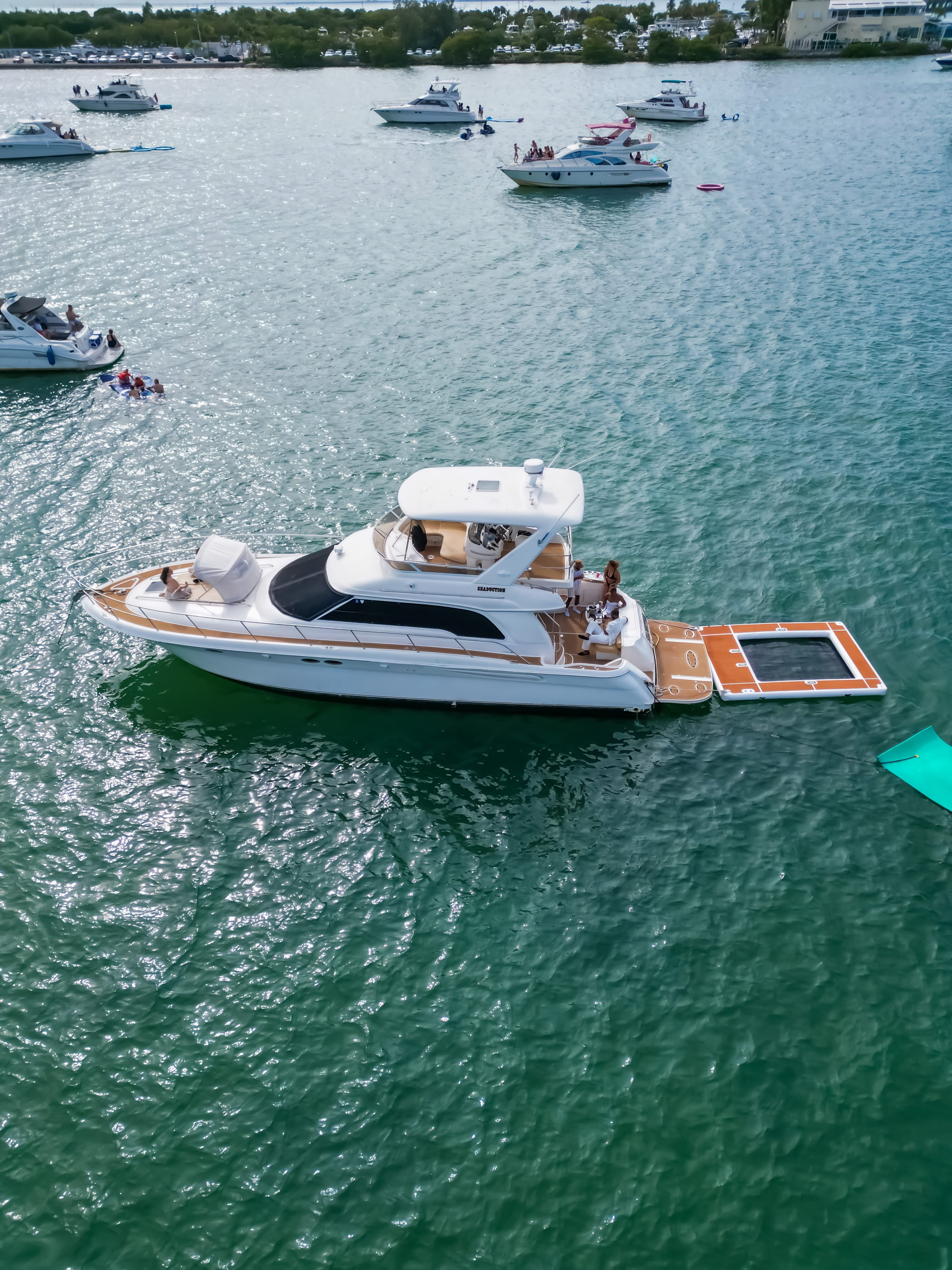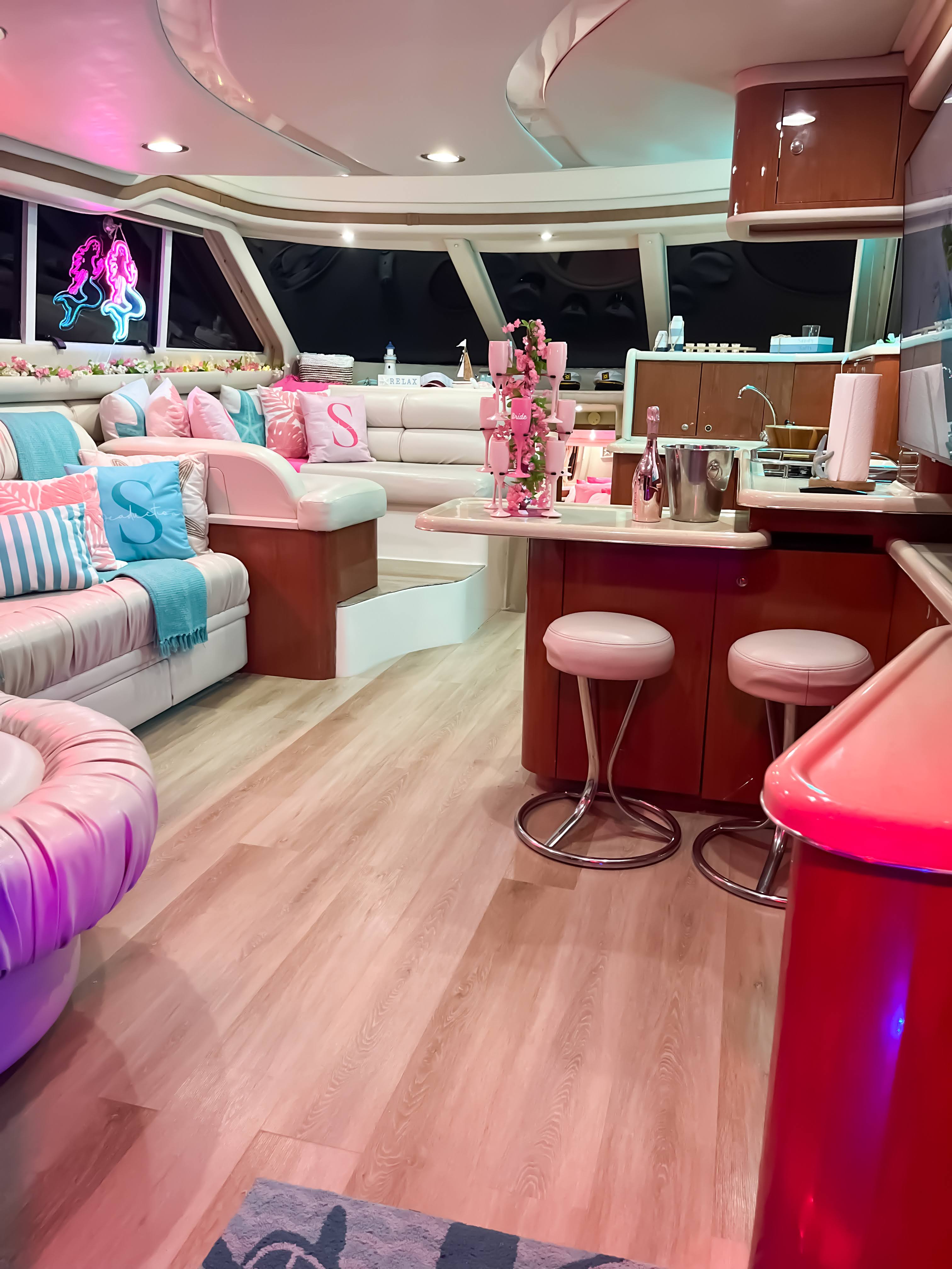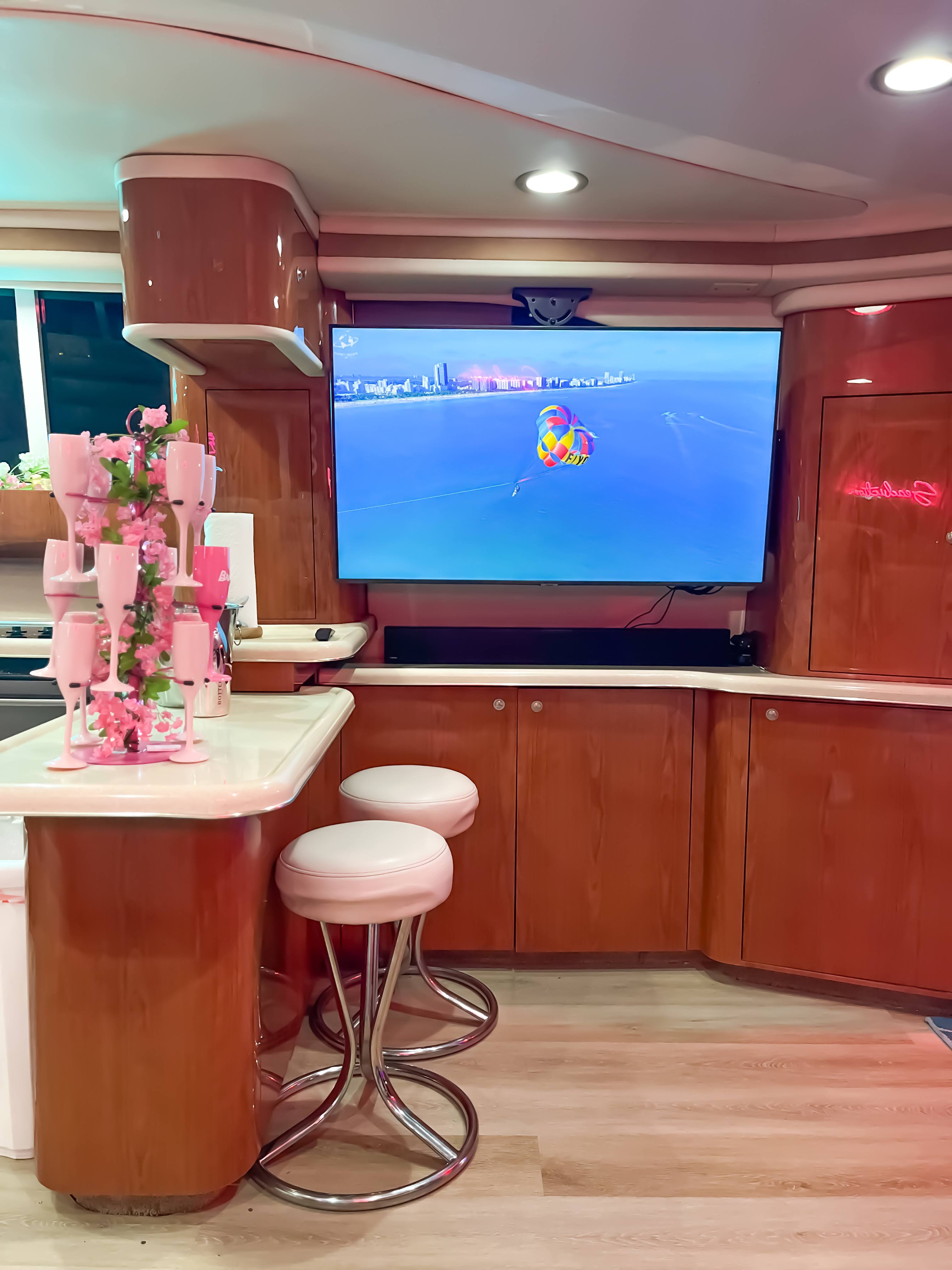 Featuring a sleek ivory-and-tan exterior, open flybridge, and a spacious aft lounge, it’s built to accommodate up to 13 guests with style and comfort. Ideal for day charters and cityscape escapes, it offers: