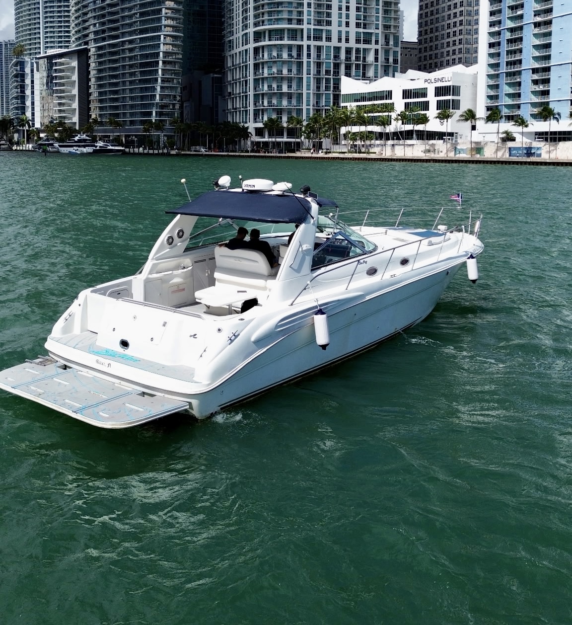 This 45′ foot sea Ray blends sporty elegance with practical design, making it a standout choice for midsize charters. With its white and navy hull, shaded cockpit, and open lounge layout, it’s designed for relaxed gatherings and coastal adventures. Large windows, cushioned seating, and a sleek canopy ensure style and shade while enjoying panoramic views. Ideal for up to 13 guests, it delivers reliable performance and effortless comfort across every hour on the water.